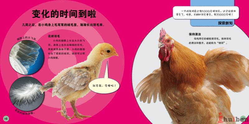 《雏鸡变母亲》啾!一只小小的、毛茸茸的雏鸡正在被孵出来。跟着它,我们可以看到它如何学会啄食和拍打翅膀。我们还能看到它如何变化和成长为一只母鸡。了解动物的成长规律。书中全部都是真实的、羽翼漂亮的小鸡图片,还有许多关于鸡的趣闻。