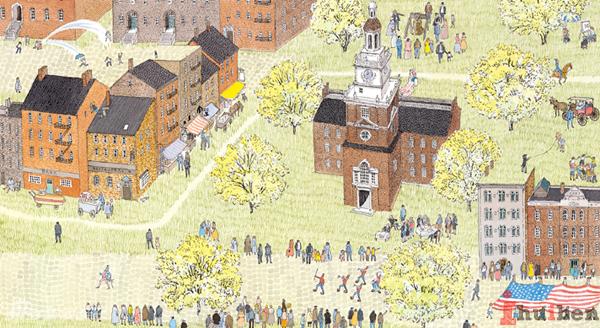 美国土地辽阔,境内地形不尽相同,有平原、山地、森林、草原,安野光雅自西向东画出了在美国的旅途,经过一个个城市,感受不同的地形风貌,别有一番滋味。在《旅之绘本Ⅱ》(意大利篇)中,安野画上了《偷自行车的人》中的场景,电影也非常能体现一个国家的文化,而美国在世界电影史上有着举足轻重的地位,因此在美国篇里,我们可以看到更多经典电影的场景,也可以找到许多电影明星的画像。找找看,能不能发现《西区故事》《乱世佳人》《父辈的旗帜》等电影里的情节呢?卓别林、玛丽莲?梦露、格利高里?派克等许多熟悉的电影明星也会出现在画中哦。另外,也不要忘记寻找很多经典绘本和漫画中的角色,比如《好脏的哈利》《爱花的牛》《小房子》《野兽出没的地方》《在森林里》《和我一起玩》《小熊》《花生漫画》等等。与前几本中较多的乡村景致和古老城市不同,美国篇里还可以欣赏到诸如纽约这类现代化的大都市的街景,以及大游行的热闹场面。