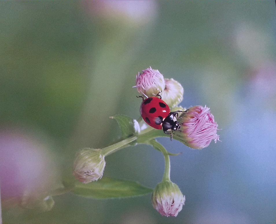误以为春天已经来临的小瓢虫,从树叶下爬了出来。