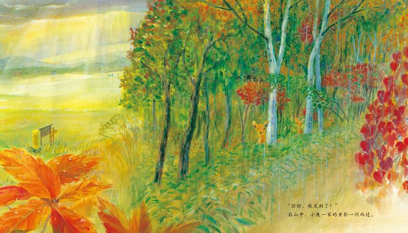 秋天到了。森林里,蘑菇长出来了,树叶变成了金黄色。山中,猴子们痛快地吃着柿子。海上,渔夫们卖力地捕捞着大马哈鱼。田野里,稻谷丰收了!小河边,各种虫子的叫声此起彼伏。