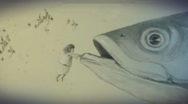 鱼还是条小鱼时,小女孩无意间救了它。从此以后,鱼会闪着冰蓝色的鱼鳍,来到女孩梦中和她说话。鱼的身体不断长大,当它掀起翻覆小镇的骇浪,也只有小女孩能了解大鱼内心的愧疚与孤寂。为了不再伤害小镇,大鱼只身游往又远又冰又冷的北海,有一天海水退潮,巨大的鱼竟然在岸上搁浅了……