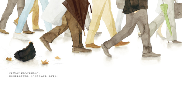 它渐渐地降落,坐在行人来往穿梭的马路上好奇地打量着周围的一切,感叹着这个不一样的世界。她摇晃着屁股爬了起来,新鲜而惊喜的城市生活扑面而来:高高大大的楼房、琳琅满目的商店、神奇的会动的楼梯、闪动着好看图案的大屏幕……城里面的新鲜玩意儿可真多啊,那都是佩吉从未见过的。她一边走一边张望着,时而转圈,时而跳舞,一会儿蹦上水池,一会儿逗逗时髦的城里小狗,一会儿逛逛打折内衣店,这样意外的旅行似乎也挺不错的。傍晚来临,橱窗的沙发给了佩吉一个暂时安定的小窝,这个软绵绵的东西让佩吉不禁想起了自己在乡下的家——那个虽不大却温暖的地方……