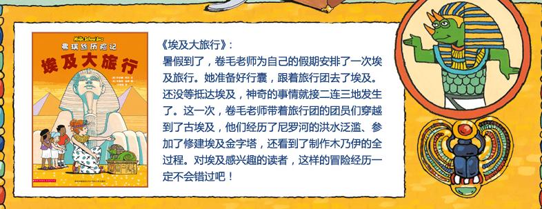 《埃及大旅行》:暑假到了,卷毛老师为自己的假期安排了一次埃及旅行。她准备好行囊,跟着旅行团去了埃及。还没等抵达埃及,神奇的事情就接二连三地发生了。这一次,卷毛老师带着旅行团的团员们穿越到了古埃及,他们经历了尼罗河的洪水泛滥、参加了修建埃及金字塔,还看到了制作木乃伊的全过程。对埃及感兴趣的读者,这样的冒险经历一定不会错过吧!