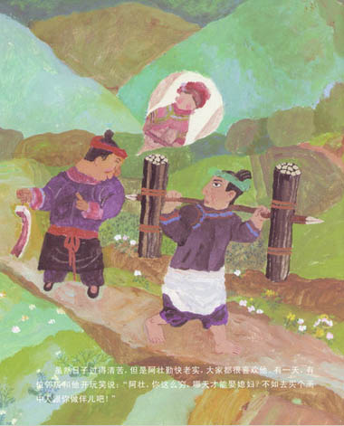 这本图画书的故事满溢浪漫情怀,也兼具奇幻变化,依着情节发展可分成两段,前段叙述苗族青年阿壮勤奋而老实,却没有亲人相陪……