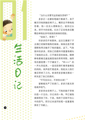 本书的主人公多多和许多小朋友一样,是个不爱写日记的孩子,每天重复的生活,怎么会写出生动的日记呢?直到有一天他遇到了从日记本中蹦出来的日记精灵!可爱的精灵告诉多多,只有充满感情和真实的好日记,才是维持他生命的营养,是他赖以生存的美食,并且启发多多如何写好各种不同题材的日记,多多在和日记精灵相处的过程中逐渐认识到了写好日记的奥秘,学会了认真地感知周围的一切,并且把自己所见、所感,变成自己童年的记忆——日记。多多的日记越写越好了,形式也越来越多样化了,日记精灵非常高兴,两个小家伙成了形影不离,无话不谈的好朋友。相信,每个小朋友都能在多多身上看到自己的影子,从多多和日记精灵的故事里学习到如何写好日记的奥秘!