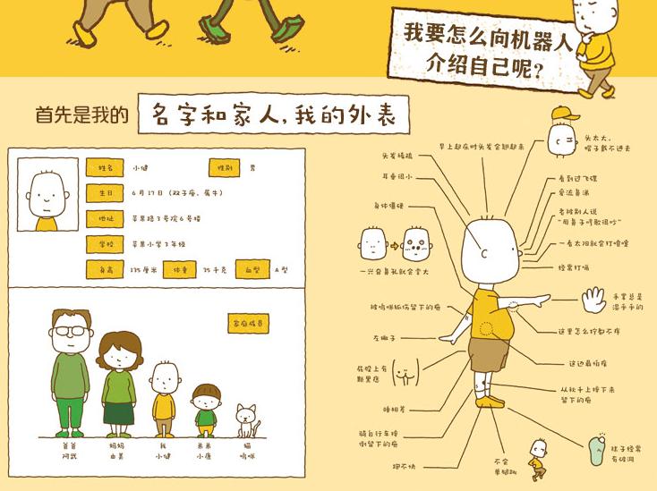 每天都要写作业,打扫卫生,整理房间……好烦啊!我要订做一个机器人,所有烦人的事都交给它去做!机器人替身可不能穿帮,必须跟我一模一样才行。我要怎么向机器人介绍自己呢?