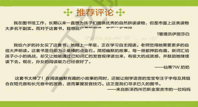 本套书包括80个简单有趣的小故事,每个故事用发音规律相同的单词编写而成,系统涵盖了各字母及其组合的发音规律。故事情节新奇有趣、诙谐幽默、充满奇思妙想,故事中的人物活灵活现,所采用的语言原汁原味、纯正地道,让孩子在阅读故事、体验情节的过程中掌握英文字母和字母组合的发音规律。