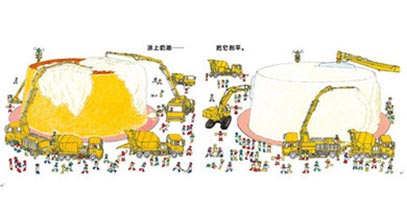在男孩儿和他的爸爸妈妈出去的时候,小人儿们来到了他们家的厨房里。铲车、起重车、推土车、搅拌汽车……运用各种工程车,小人儿们到底做出了什么呢?