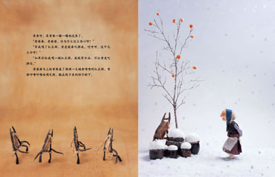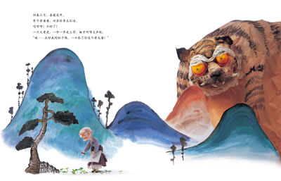 这个故事的情节设置可谓跌宕起伏。在书的第一页老虎就出现了,气氛一下子紧张起来,并埋下让人情绪不安的伏笔。冬天来了,随着老婆婆的忧愁,家什物件们一个个上场,角色变化,和老婆婆的对话内容却不变!读者不禁会猜想:下一个会是谁呢?有什么本领呢?这种重复又重复的故事情节安排得极为巧妙,让读者在一次次的猜测中,仿佛能听到老虎沉重的脚步踏着积雪一步步逼近!面对那些看不出有多大本事的小东西,不免为老婆婆暗暗捏着一把汗!老虎再度出现后,家什物件们各显其能,行动敏捷。故事一下子发展到高潮,而画家也用两个半跨页的分割小图解说,情节发展迅速,就像电影的特写快放镜头,三两下就结果了老虎的性命!有了前面缓慢情节的设置,才能有结局那更加畅快淋漓大快人心的感觉啊!随着老虎坠入江水,大家的情绪一下子放松下来,热闹和睦地享受红豆粥,心情就像最后画面中画家笔下的炊烟,轻松飞扬、祥和安宁。
