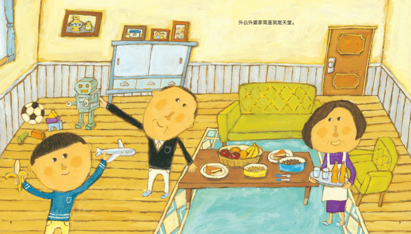 爸爸和妈妈要外出,我要到外公外婆家住一晚。和爱生气的妈妈不一样,外公外婆家简直就是天堂,我可以吃所有我想吃的东西,打翻了果汁,外公外婆也不会生气……对于祖父母来说,孙辈是“含在嘴里又怕化了的人”,他们做父母时对自己的孩子也很严格,但是对待孙辈却非常宽容,这是为什么呢?绘本中的外公是这样说的,“孙辈就是孩子的孩子,不知道为什么,就是特别想宠爱你”。 和刚出生的孩子一样,初次为人父母的父母也是*次面对这个身份,也需要学习很多。养育孩子的过程也是父母养成的过程,所以他们总是很用力,很焦躁,不能从容的面对遇到的问题。 育儿面对的不全是孩子的可爱,还需要承担其中的疲惫、痛苦和不情愿。但是一旦成为祖父母,他们就能客观的看待育儿这件事,不会用力过猛,反而能充分的感受和自己血脉相连的孙辈的天真和可爱,可以说是身为祖辈的这种从容酝酿了具有包容力的温柔。在孙辈看来,祖父母家就是避难所,不仅没有严厉的训斥,还能被宠爱。可能正是这种相互的满足,祖父母和孙辈之间的关系才能这样融洽吧。 看完这本书,你有没有觉得很幸福呢?日语中是不区分外公外婆和爷爷奶奶的,所以作者的本意是写给所有隔代的亲人,希望你们能尽情享受这份天伦之乐。