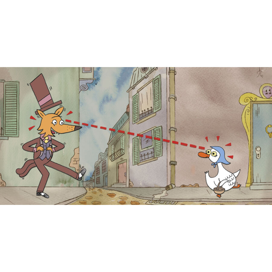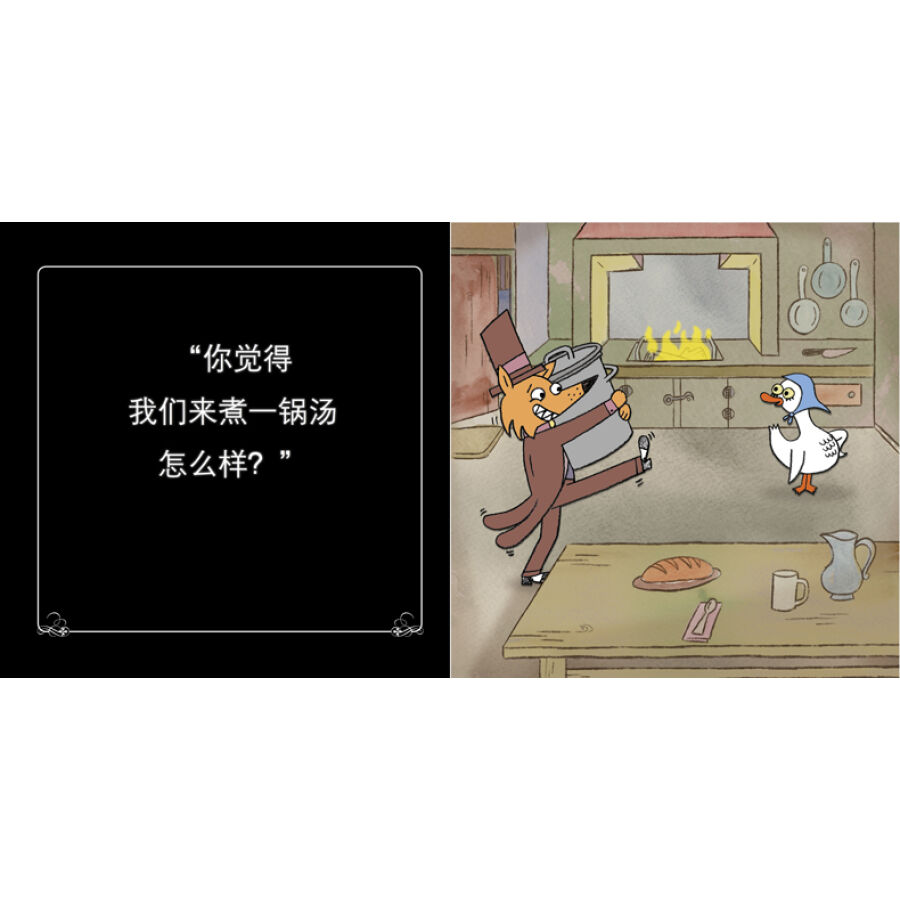 故事主角是经典的卑鄙恶棍和小天真,即一只身穿三件套西装、头戴礼帽,满脸微笑的狐狸,吸引了一只戴着头巾、肥胖的鹅妈妈的注意力。晚餐来了!狐狸心想。狐狸问鹅妈妈,是否愿意陪他一起去散步,鹅妈妈同意了;狐狸又邀请鹅妈妈去黑森林,她也同意了;然后又邀请她参观厨房,并且准备煮一锅汤,还说只差最后一种食材。随着情节的推进,一群鹅宝宝发出越来越强烈的警告,说你可千万、千万、千千万万别上当啊!故事达到高潮时,鹅妈妈的悲惨结局似乎无可避免了。