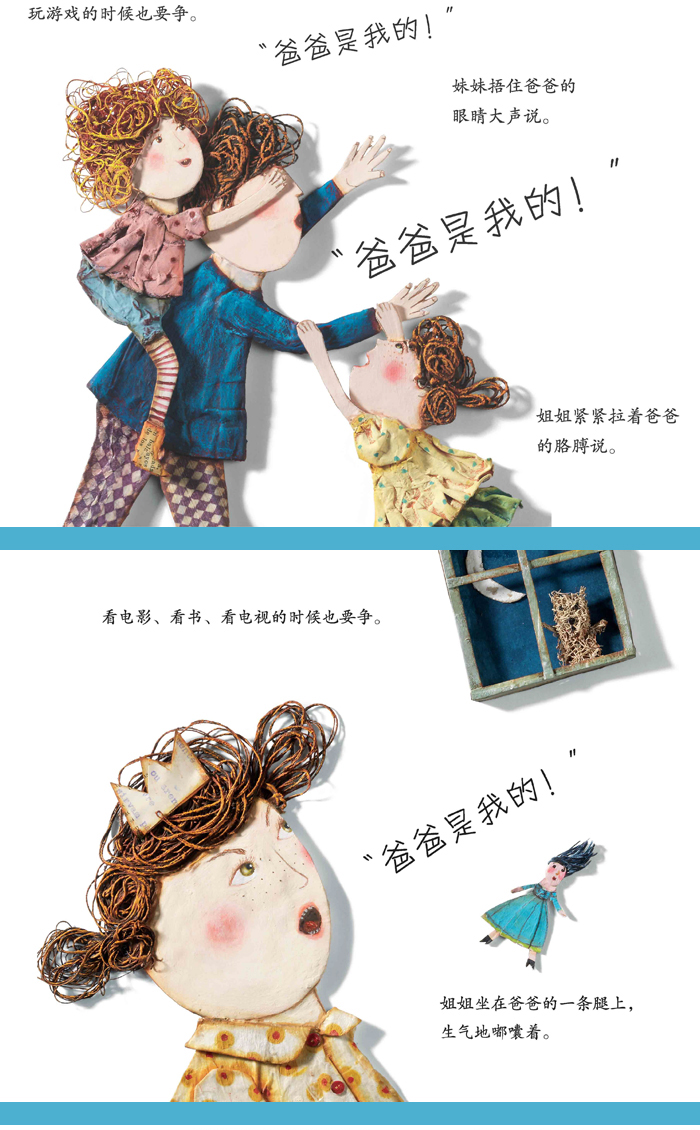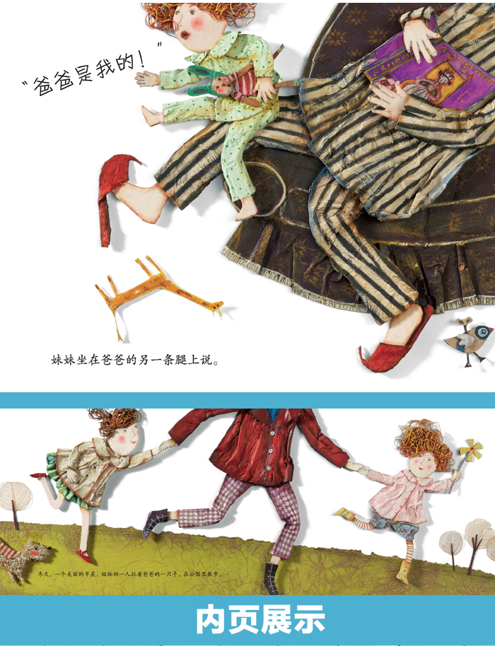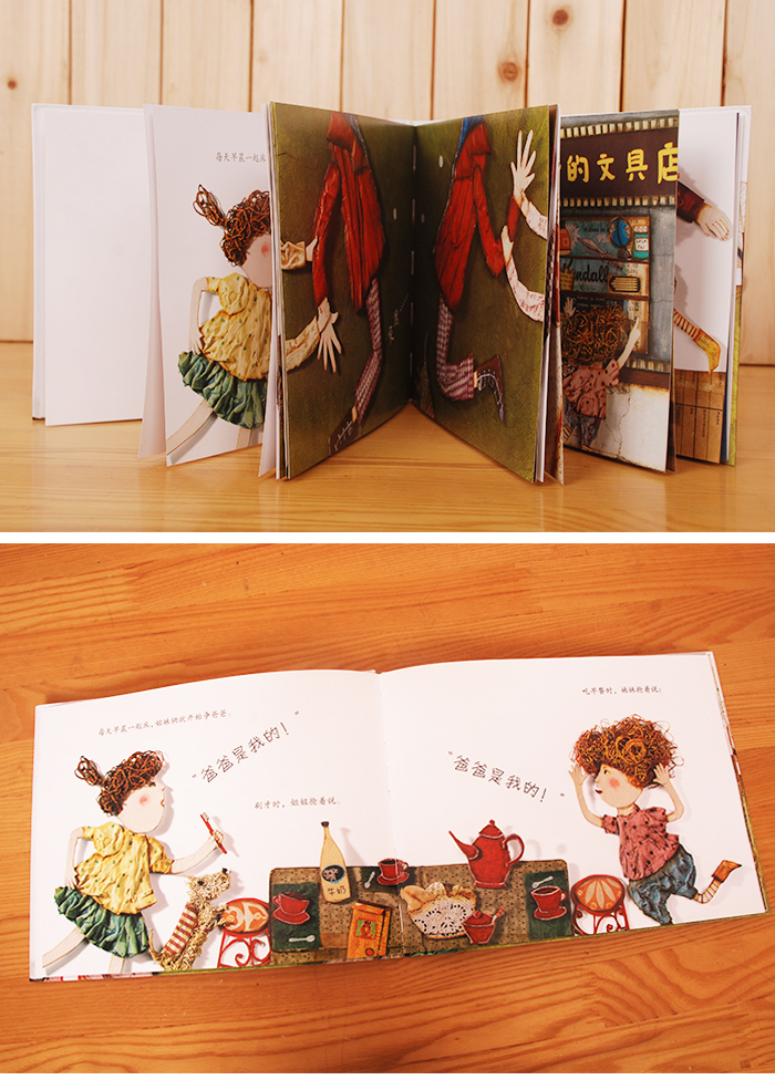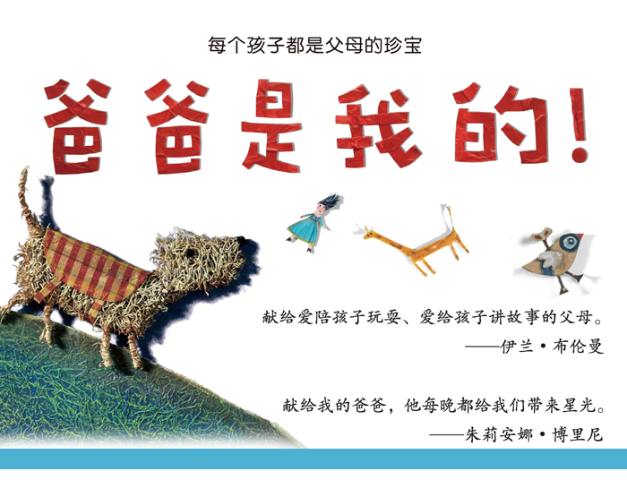 作者说: 这个故事是根据一件真事儿改编的。有一天,我牵着我女儿们的手在散步。突然,她们一人拽着我的一只手,开始使劲儿拉,不停哭着喊:“爸爸是我的!”我痛得大叫:“你们快把我扯开了!”她们这才停止了拉扯。就在这时,我产生了创作这个故事的灵感。 绘者:朱莉安娜·博里尼 朱莉安娜的作品属于跨媒体艺术,融合了纸艺、雕塑、插画多种手法。她特别强调自己作品的*性,在每一幅作品中都倾注了热情和想象。她并不想让自己的作品被复制成商品大批量生产,摆满超市的货架,只是想为她的作品寻找一个知音。她的工作室就是商场,喜欢她作品的老客户会经常来挑选属于自己的独一无二的产品。 绘者说:《爸爸是我的!》让我让我想起了我的爸爸,*不同的是,他会被我们5兄妹“撕扯”!你能想象到吗?简直太不可思议了!不过这好像也挺酷的。爸爸几乎每晚都会给我们讲故事,直到现在,我还能回忆起那些快乐的童年。
